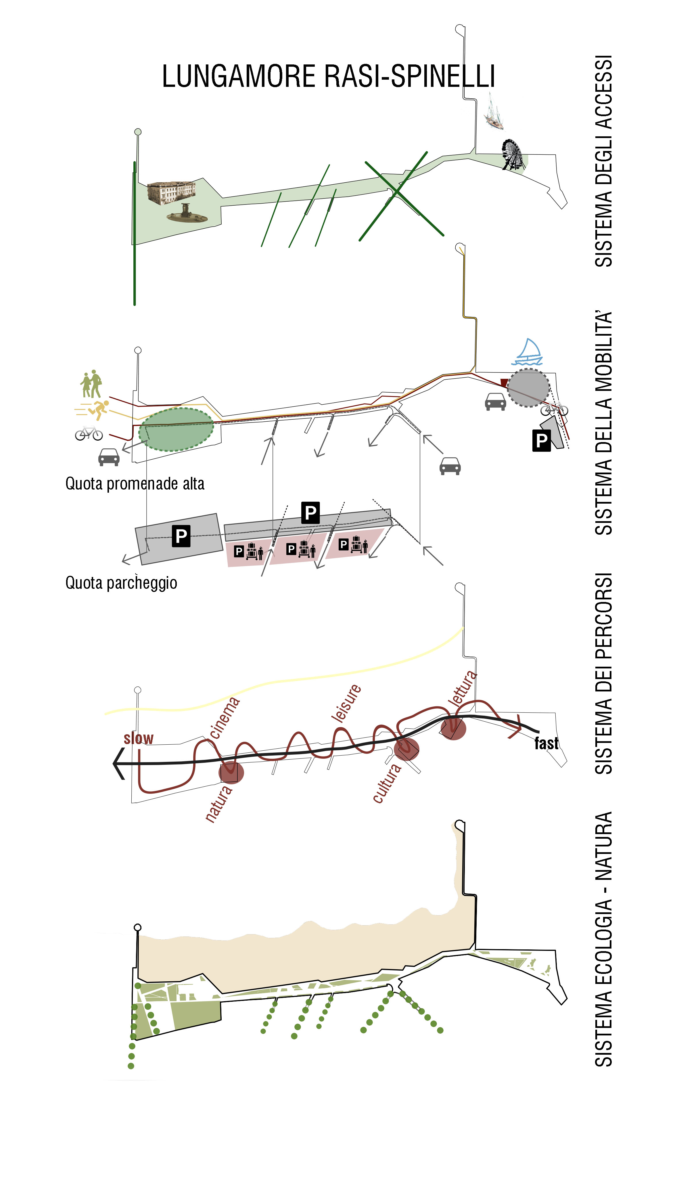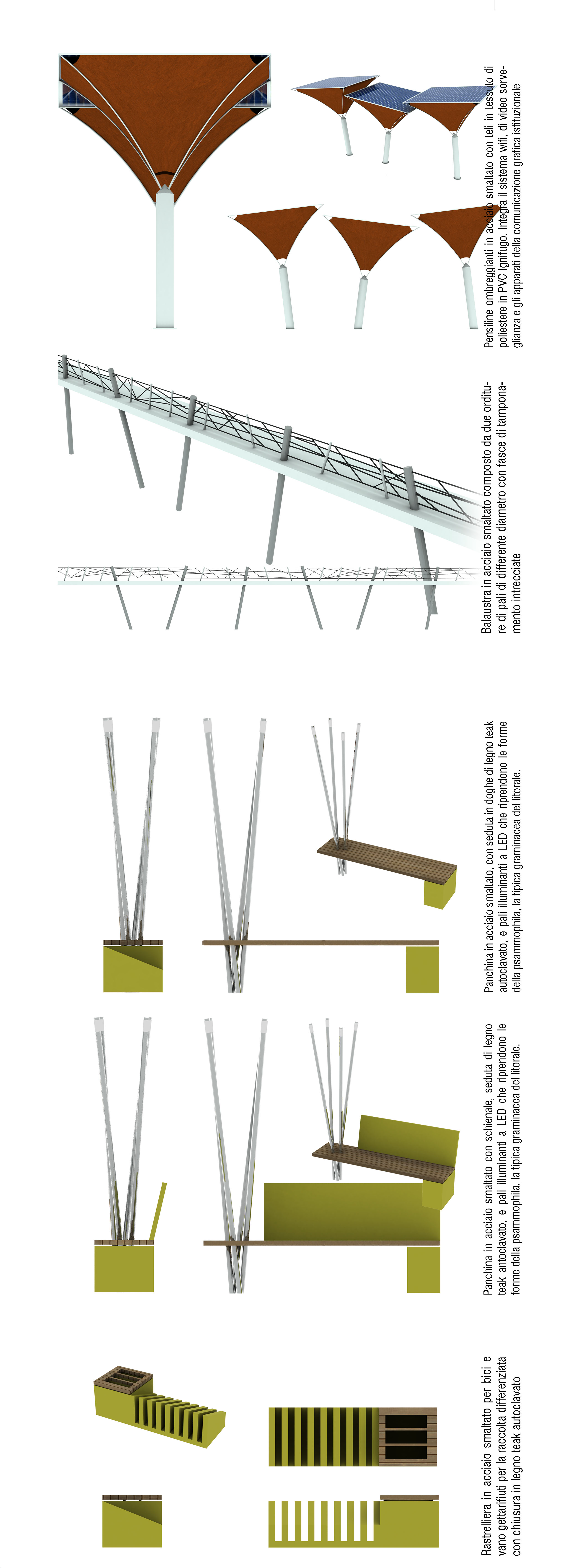 In questo scenario, il tratto del Lungomare Rasi-Spinelli, viene pensato come grande promenade verde, come un grande parco lineare, spazio multifunzione restituito alla fruizione totale (e non più stagionale) della cittadinanza e alla mobilità lenta e sostenibile. In contemporanea, è data dignità alle attrezzature balneari nell’individuazione di aree preposte nello spazio della promenade alla quota della spiaggia.