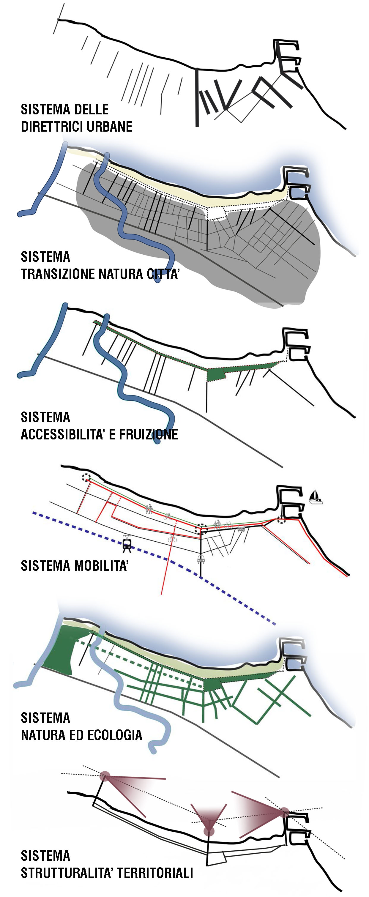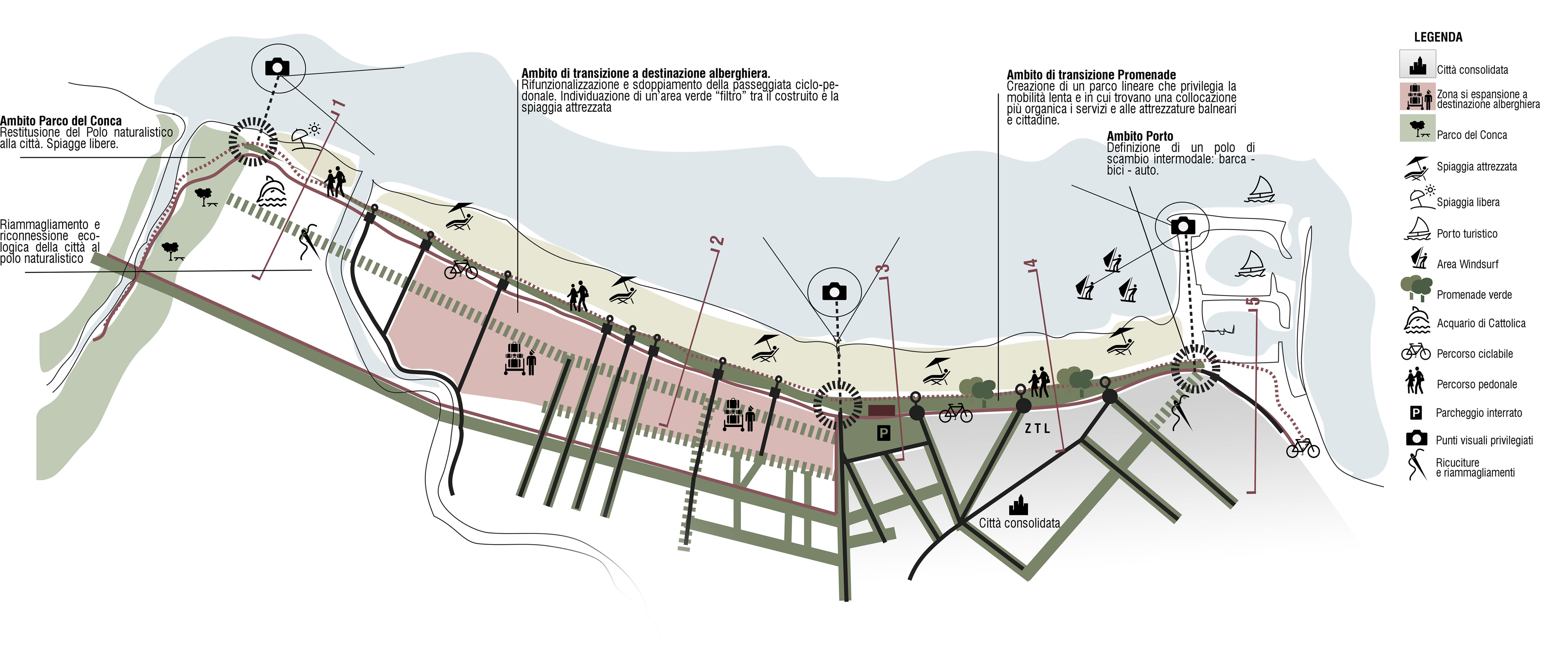 L’idea progettuale si articola partendo dalla definizione di un masterplan alla scala cittadina in cui da un polo fortemente urbanizzato, il molo turistico, si arrivi gradualmente alla creazione di un polo naturalistico, individuato nel Parco del Conca, restituendo natura alla città.